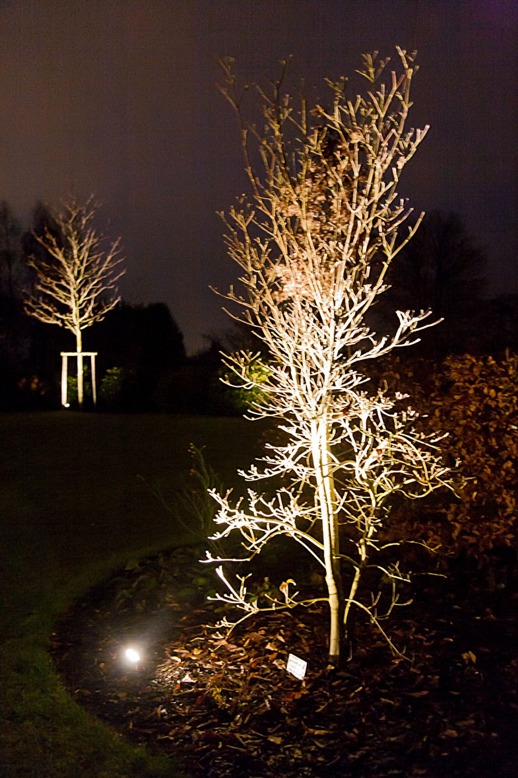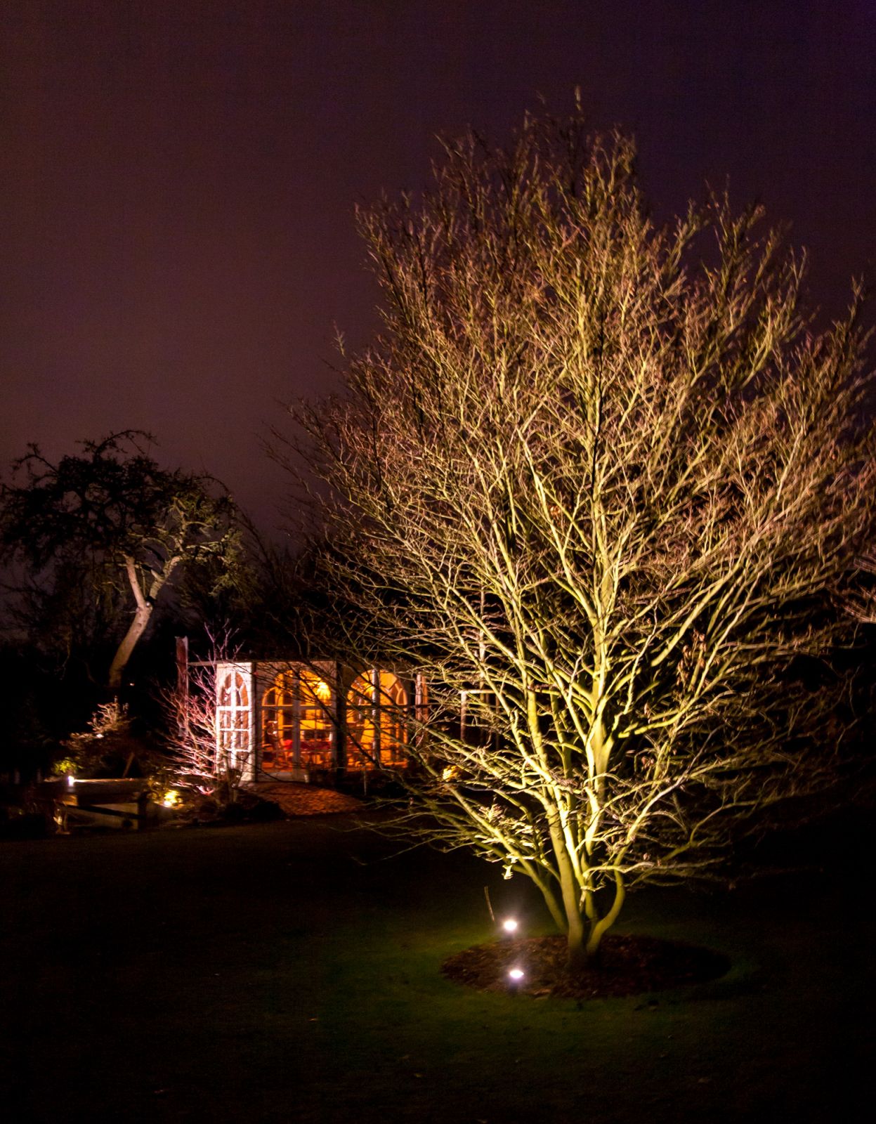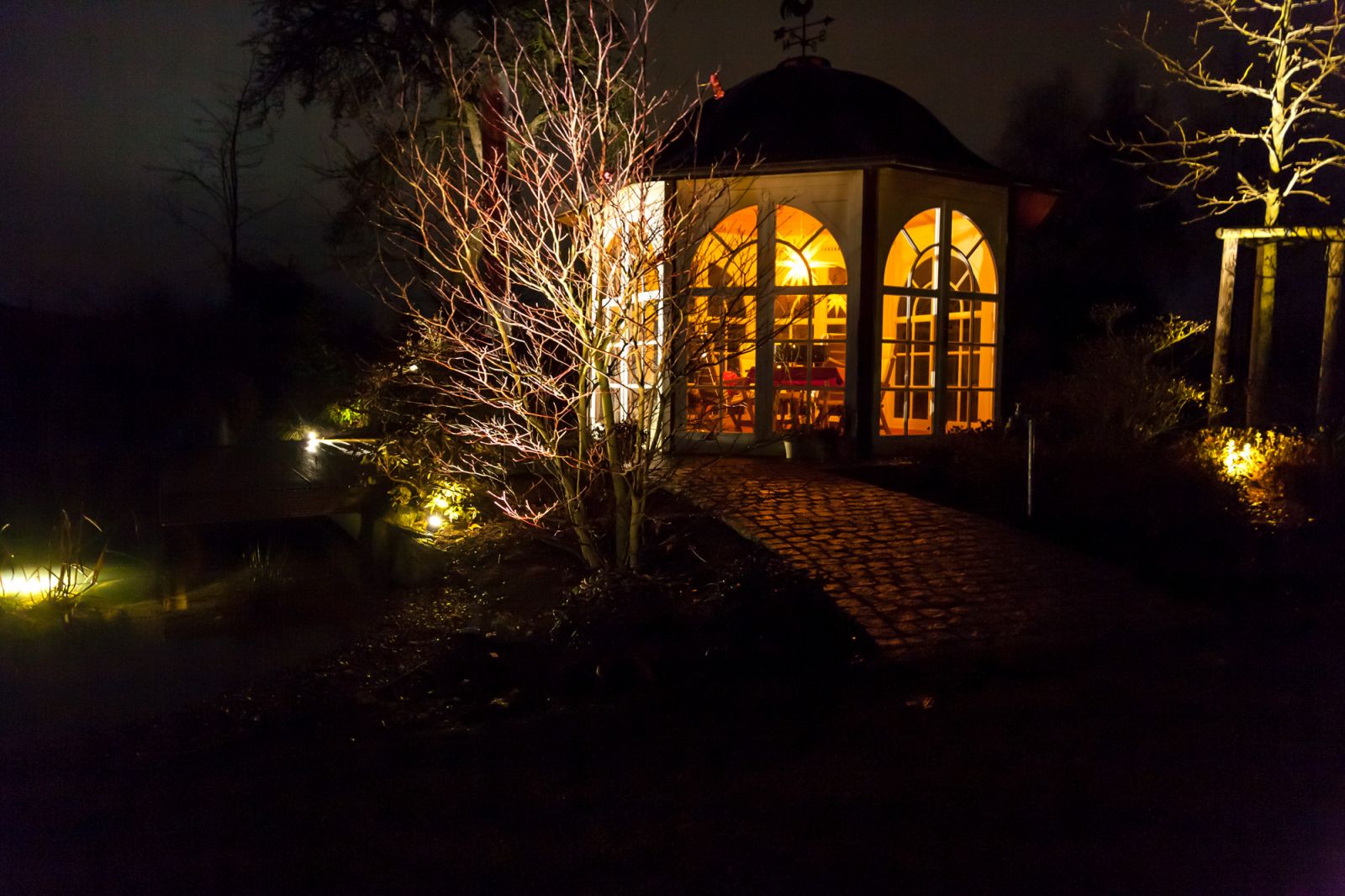 Bei Nacht sind alle Katzen grau. Nicht, wenn der Garten richtig beleuchtet wird. In diesem Garten setzen geziehlte Strahler einzelne Bäume, den Gartenpavilion und den Teich in Szene.